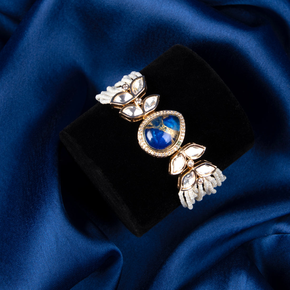 Adorned with a vivid deep blue stone centerpiece surrounded by teardrop kundan accents. Crafted with...