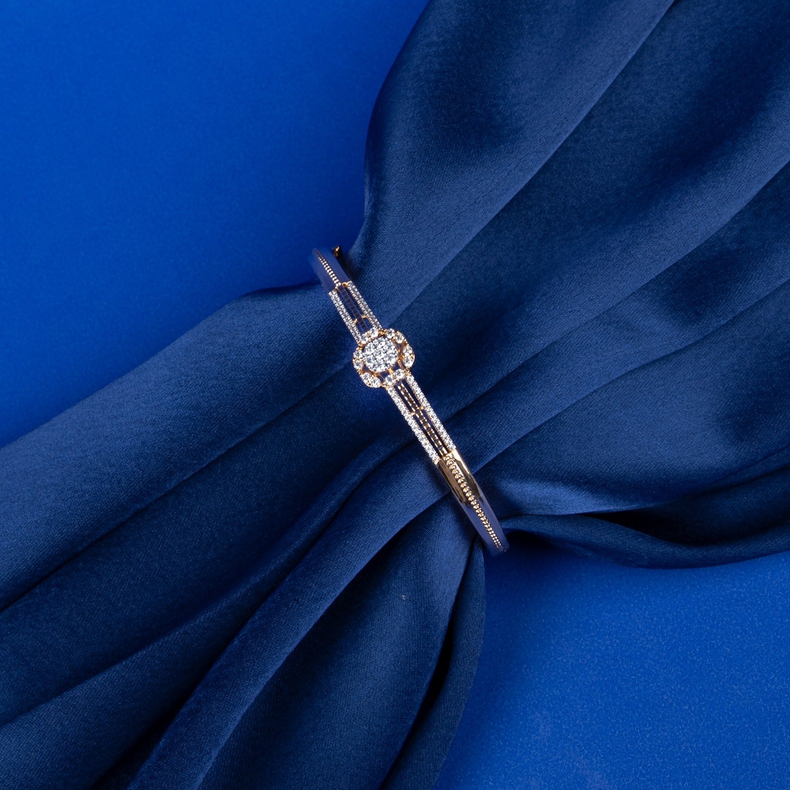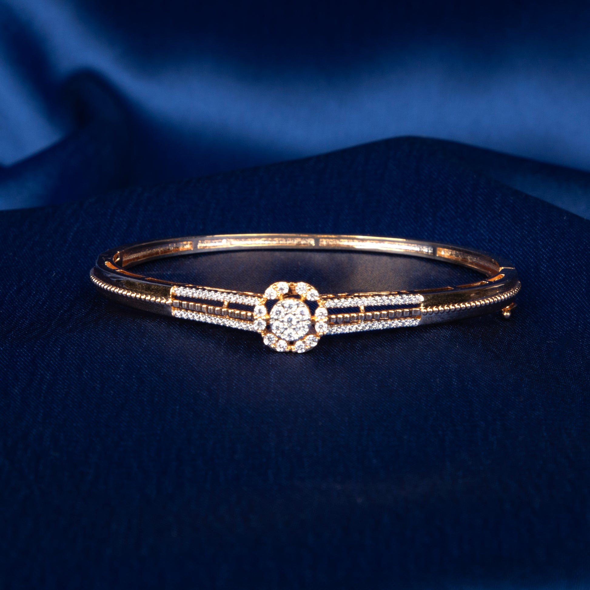 - A timeless kada design featuring a central floral halo of CZ stones.