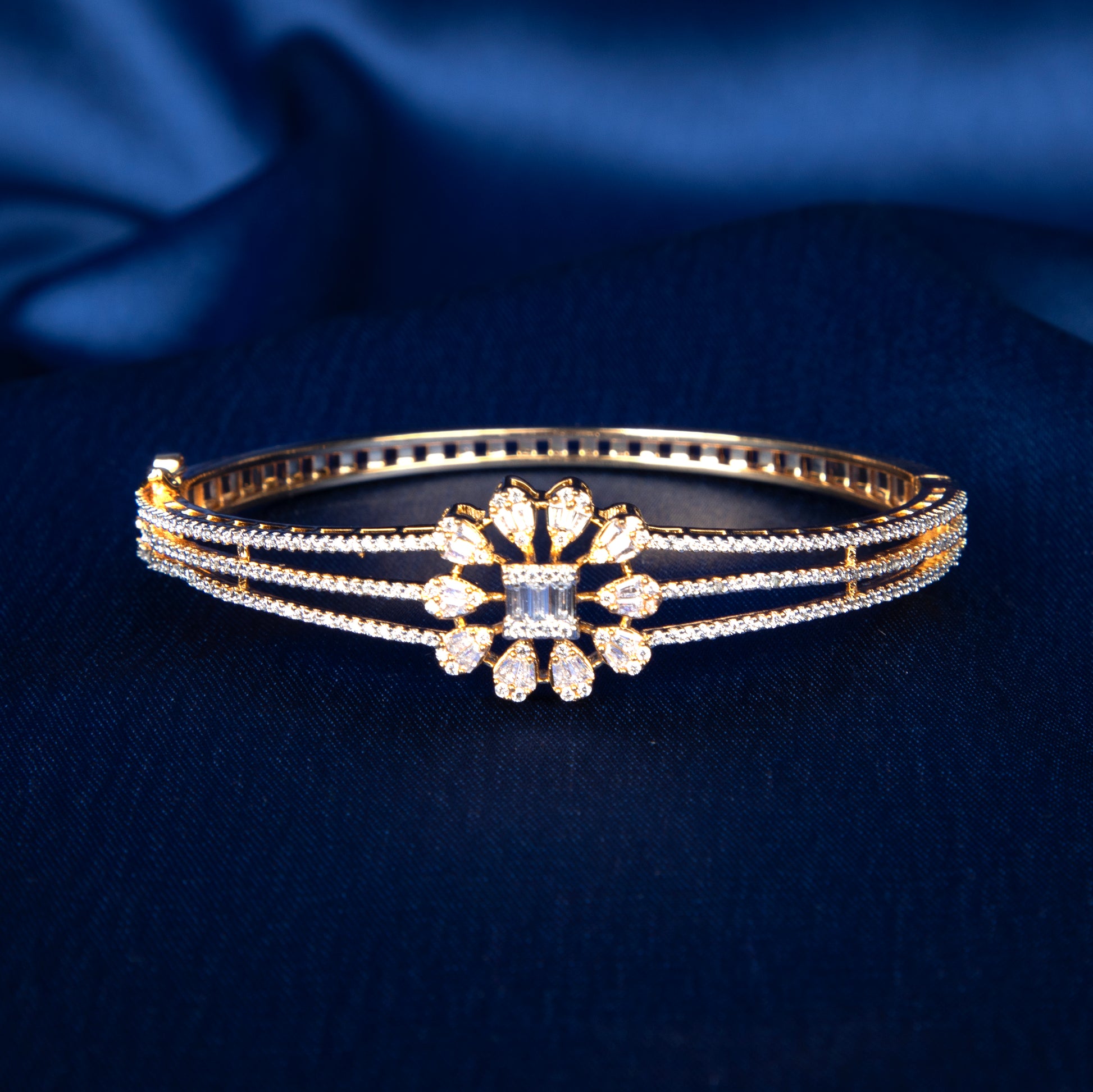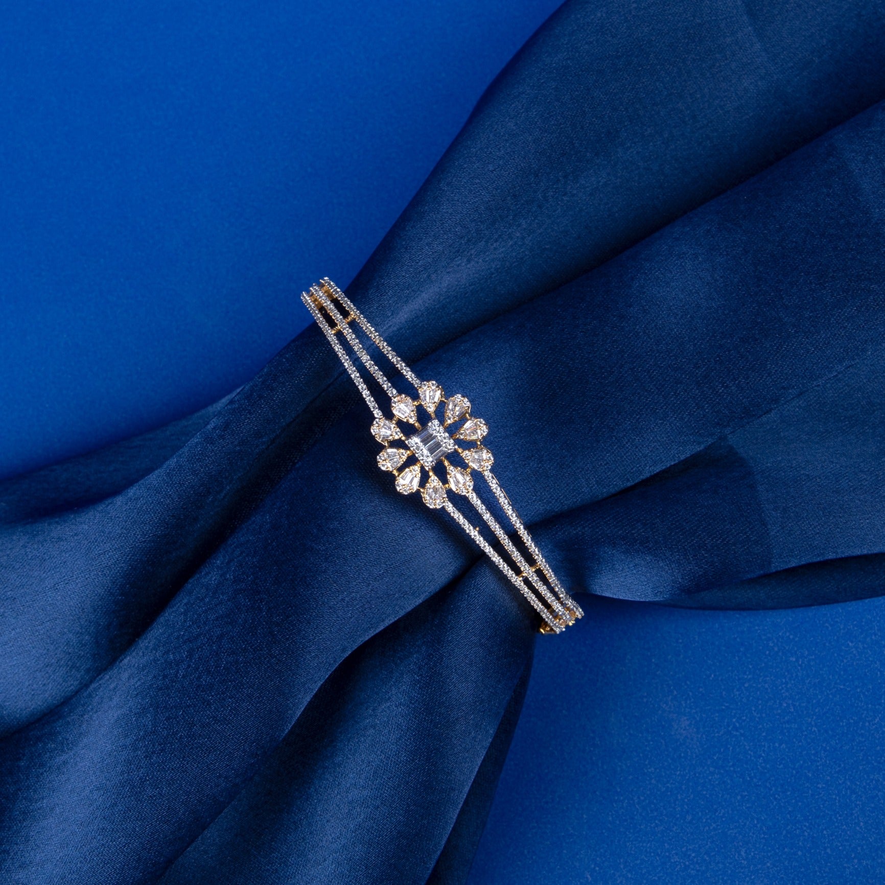 - A delicate floral motif sits at the center, crafted with baguette and teardrop CZ stones.