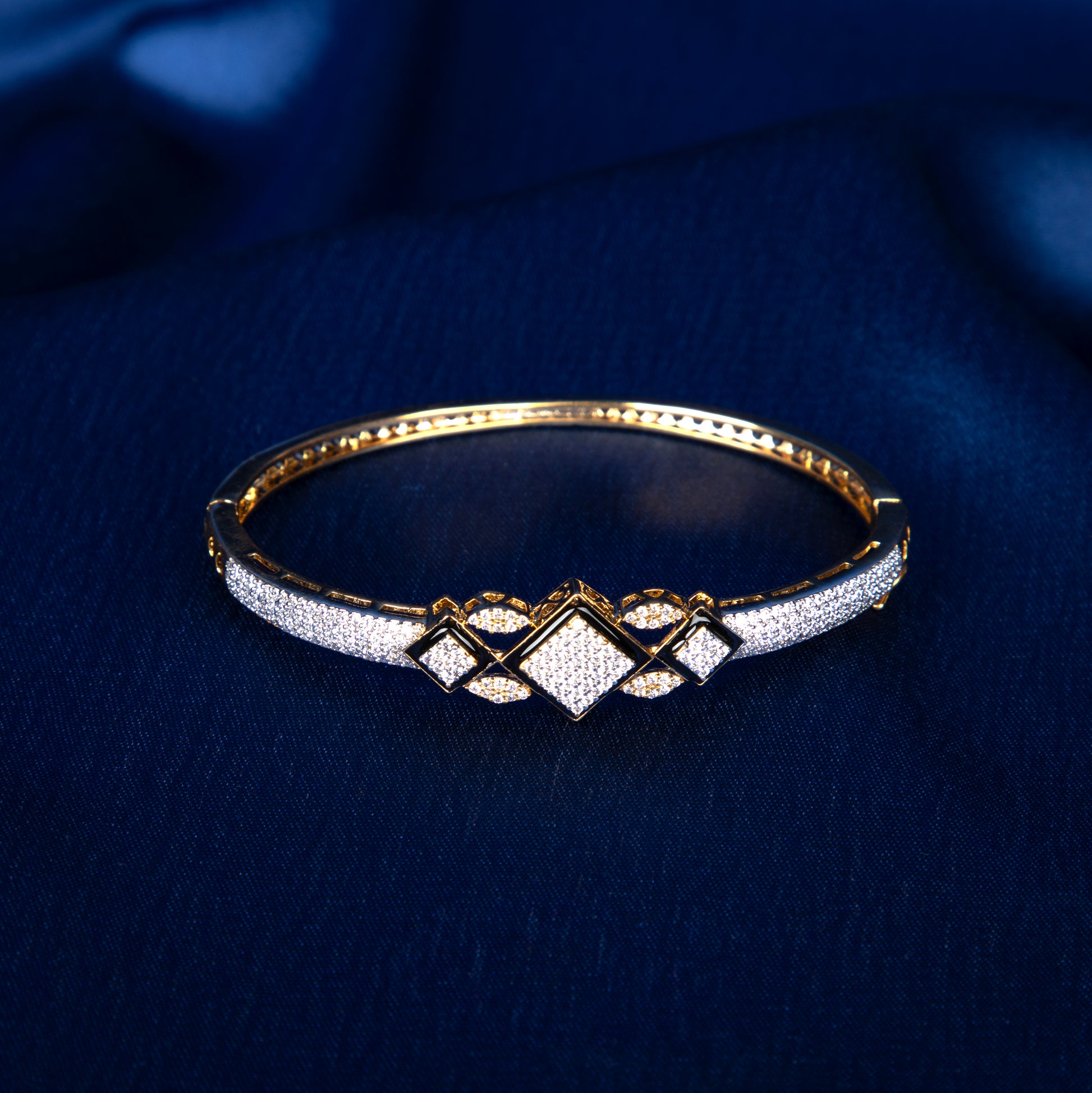 - Striking geometric design with a central square cluster flanked by enamel-framed accents.
